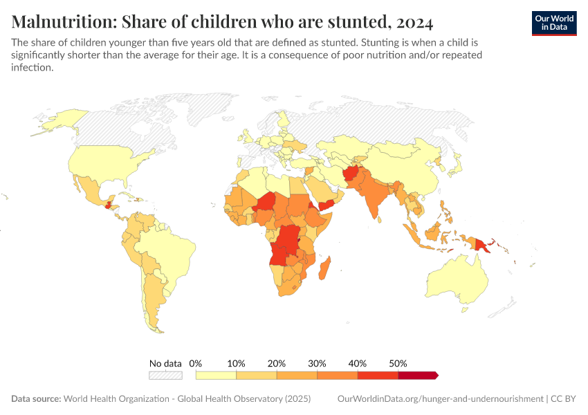“Data Page: Malnutrition: Share of children who are stunted”. Our World in Data (2025). Data adapted from World Health Organization. Retrieved from https://archive.ourworldindata.org/20250909-093708/grapher/share-of-children-younger-than-5-who-suffer-from-stunting.html [online resource] (archived on September 9, 2025).How to cite this data