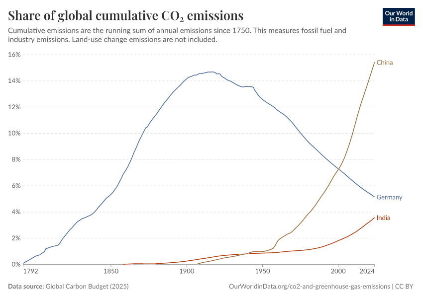 Global Carbon Budget (2025) – with major processing by Our World in Data. “Share of global cumulative CO₂ emissions” [dataset]. Global Carbon Project, “Global Carbon Budget v15” [original data]. Retrieved February 5, 2026 from https://archive.ourworldindata.org/20260119-070102/grapher/share-of-cumulative-co2.html (archived on January 19, 2026).