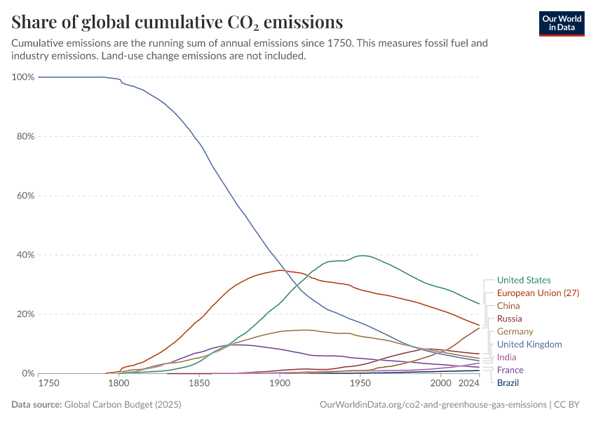 Global Carbon Budget (2025) – with major processing by Our World in Data. “Share of global cumulative CO₂ emissions” [dataset]. Global Carbon Project, “Global Carbon Budget v15” [original data]. Retrieved December 5, 2025 from https://archive.ourworldindata.org/20251204-133459/grapher/share-of-cumulative-co2.html (archived on December 4, 2025).