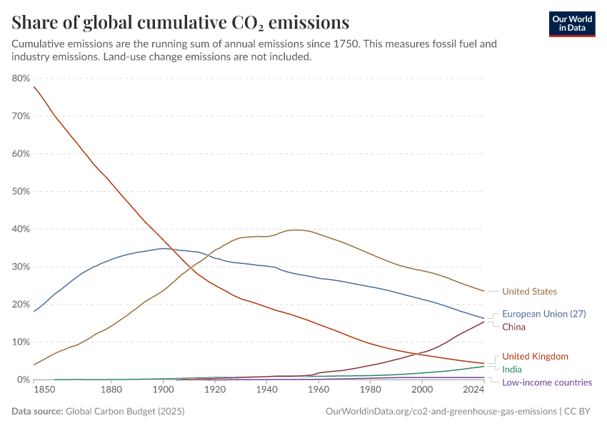 Global Carbon Budget (2025) – with major processing by Our World in Data. “Share of global cumulative CO₂ emissions” [dataset]. Global Carbon Project, “Global Carbon Budget v15” [original data]. Retrieved December 16, 2025 from https://archive.ourworldindata.org/20251204-133459/grapher/share-of-cumulative-co2.html (archived on December 4, 2025).