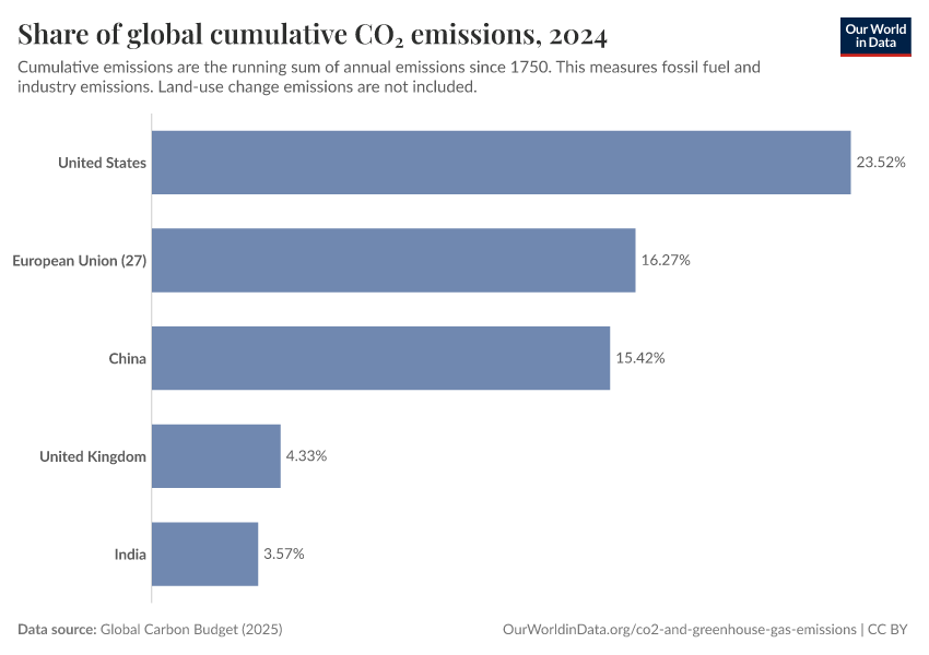“Data Page: Share of global cumulative CO₂ emissions”, part of the following publication: Hannah Ritchie, Pablo Rosado, and Max Roser (2023) - “CO₂ and Greenhouse Gas Emissions”. Data adapted from Global Carbon Project. Retrieved from https://archive.ourworldindata.org/20260304-094028/grapher/share-of-cumulative-co2.html [online resource] (archived on March 4, 2026).How to cite this data