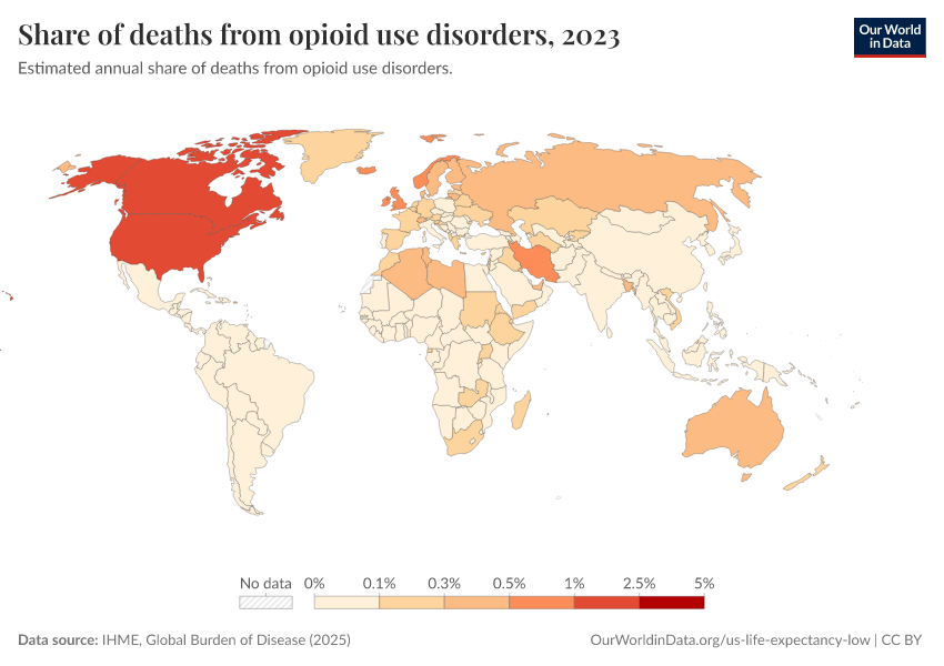 IHME, Global Burden of Disease (2024) – with minor processing by Our World in Data. “Share of deaths from opioid use disorders” [dataset]. IHME, Global Burden of Disease, “Global Burden of Disease - Deaths and DALYs” [original data]. Retrieved January 19, 2026 from https://archive.ourworldindata.org/20250909-093708/grapher/share-of-deaths-from-opioid-overdoses.html (archived on September 9, 2025).