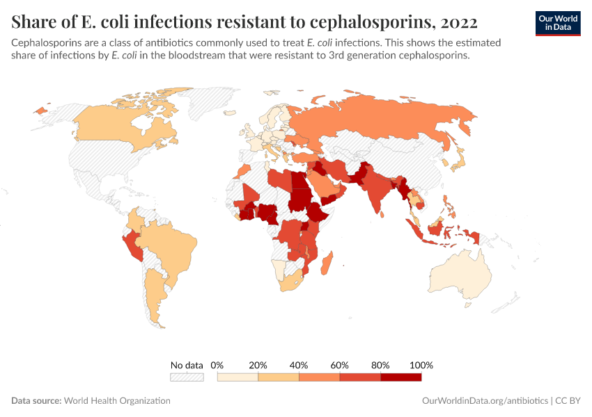 “Data Page: Share of E. coli infections resistant to cephalosporins”. Our World in Data (2025). Data adapted from World Health Organization. Retrieved from https://archive.ourworldindata.org/20251125-165536/grapher/share-of-e-coli-bloodstream-infections-due-to-antimicrobial-resistant-bacteria.html [online resource] (archived on November 25, 2025).How to cite this data