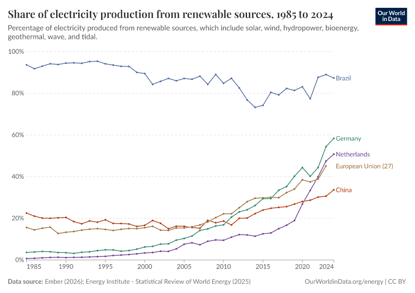 “Data Page: Share of electricity generated by renewables”, part of the following publication: Hannah Ritchie, Pablo Rosado, and Max Roser (2023) - “Energy”. Data adapted from Ember, Energy Institute. Retrieved from https://archive.ourworldindata.org/20260109-144605/grapher/share-of-electricity-production-from-renewable-sources.html [online resource] (archived on January 9, 2026).