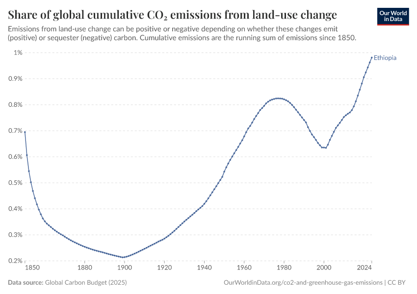 “Data Page: Share of global cumulative CO₂ emissions from land-use change”, part of the following publication: Hannah Ritchie, Pablo Rosado, and Max Roser (2023) - “CO₂ and Greenhouse Gas Emissions”. Data adapted from Global Carbon Project. Retrieved from https://archive.ourworldindata.org/20251204-133459/grapher/share-of-global-cumulative-co-emissions-from-land-use-change.html [online resource] (archived on December 4, 2025).