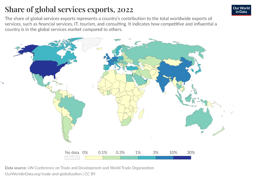 “Data Page: Share of global services exports”. Our World in Data (2025). Data adapted from UN Conference on Trade and Development and World Trade Organization. Retrieved from https://archive.ourworldindata.org/20251125-165536/grapher/share-of-global-services-exports.html [online resource] (archived on November 25, 2025).How to cite this data