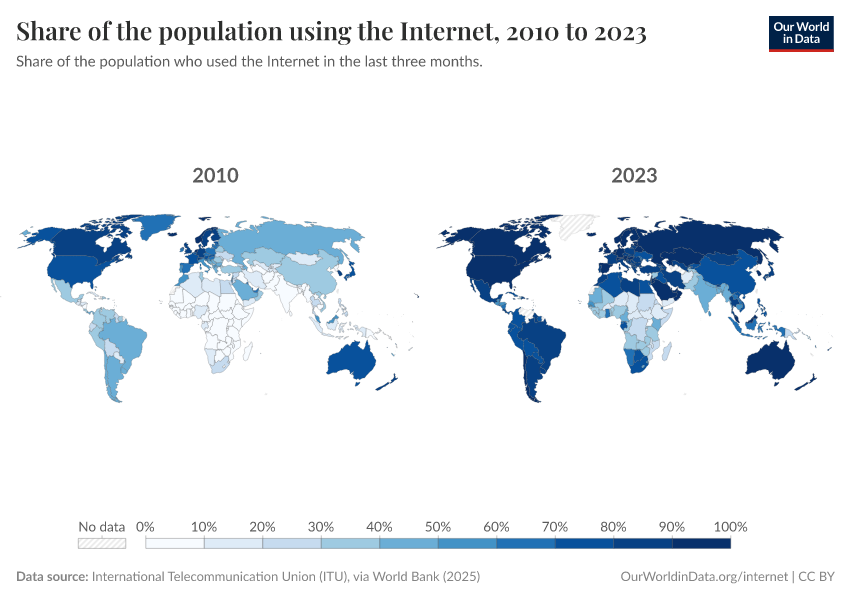 “Data Page: Share of the population using the Internet”, part of the following publication: Hannah Ritchie, Edouard Mathieu, Max Roser, and Esteban Ortiz-Ospina (2023) - “Internet”. Data adapted from International Telecommunication Union (ITU), via World Bank. Retrieved from https://archive.ourworldindata.org/20250909-093708/grapher/share-of-individuals-using-the-internet.html [online resource] (archived on September 9, 2025).How to cite this data
