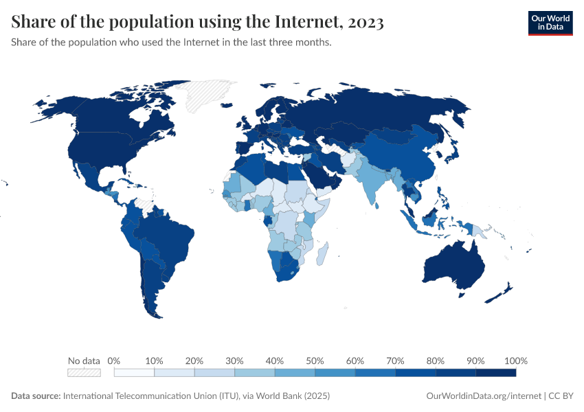 “Data Page: Share of the population using the Internet”, part of the following publication: Hannah Ritchie, Edouard Mathieu, Max Roser, and Esteban Ortiz-Ospina (2023) - “Internet”. Data adapted from International Telecommunication Union (ITU), via World Bank. Retrieved from https://archive.ourworldindata.org/20250909-093708/grapher/share-of-individuals-using-the-internet.html [online resource] (archived on September 9, 2025).How to cite this data