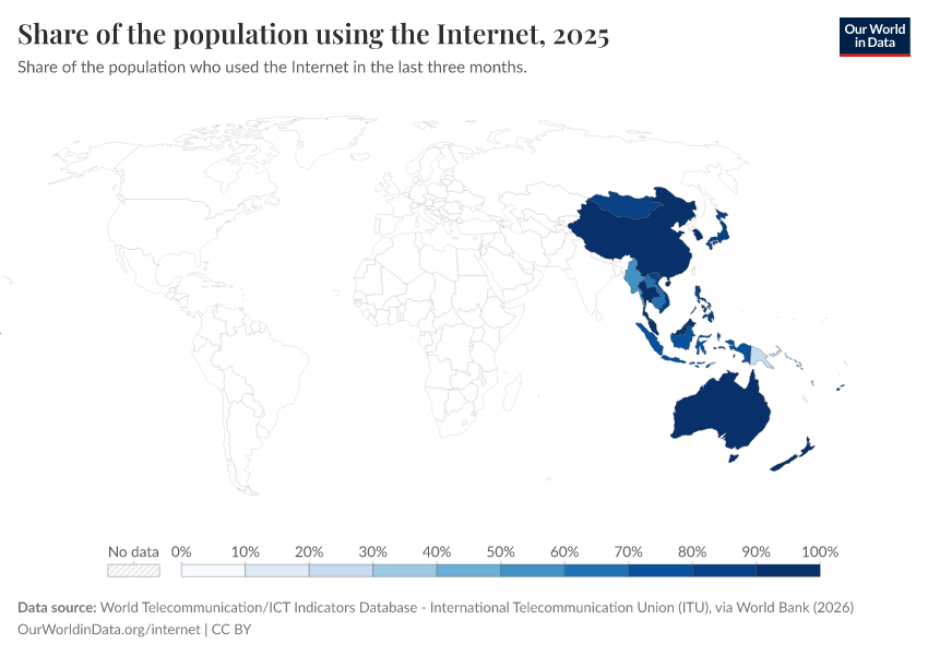 World Telecommunication/ICT Indicators Database - International Telecommunication Union (ITU), via World Bank (2026) – with minor processing by Our World in Data. “Share of the population using the Internet – International Telecommunication Union” [dataset]. World Telecommunication/ICT Indicators Database - International Telecommunication Union (ITU), via World Bank, “World Development Indicators 125” [original data]. Retrieved April 25, 2026 from https://archive.ourworldindata.org/20260420-090625/grapher/share-of-individuals-using-the-internet.html (archived on April 20, 2026).Download