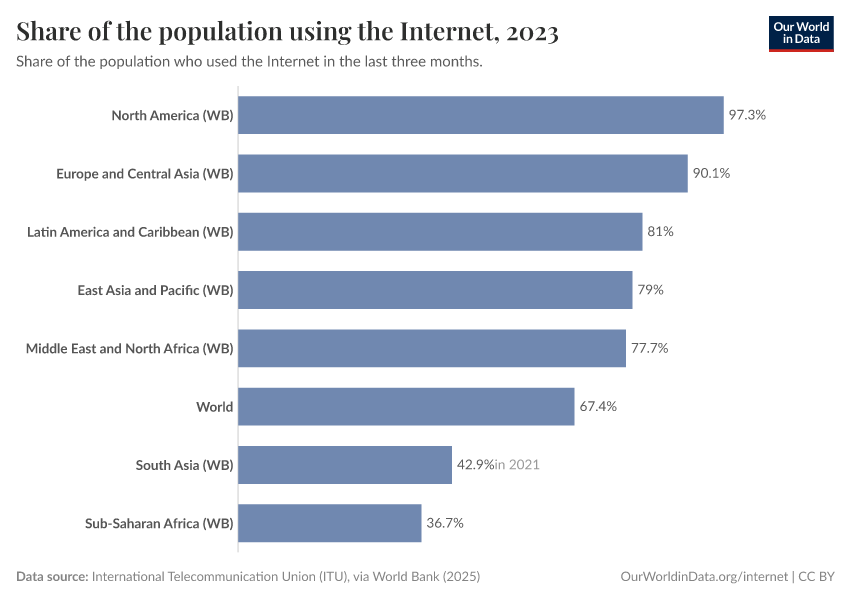 “Data Page: Share of the population using the Internet”, part of the following publication: Hannah Ritchie, Edouard Mathieu, Max Roser, and Esteban Ortiz-Ospina (2023) - “Internet”. Data adapted from International Telecommunication Union (ITU), via World Bank. Retrieved from https://archive.ourworldindata.org/20250909-093708/grapher/share-of-individuals-using-the-internet.html [online resource] (archived on September 9, 2025).How to cite this data