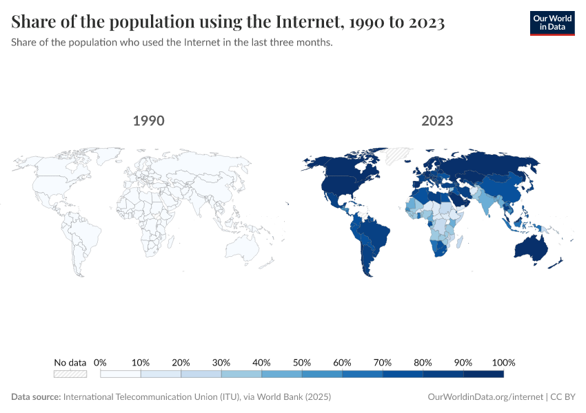 “Data Page: Share of the population using the Internet”, part of the following publication: Hannah Ritchie, Edouard Mathieu, Max Roser, and Esteban Ortiz-Ospina (2023) - “Internet”. Data adapted from International Telecommunication Union (ITU), via World Bank. Retrieved from https://archive.ourworldindata.org/20250909-093708/grapher/share-of-individuals-using-the-internet.html [online resource] (archived on September 9, 2025).