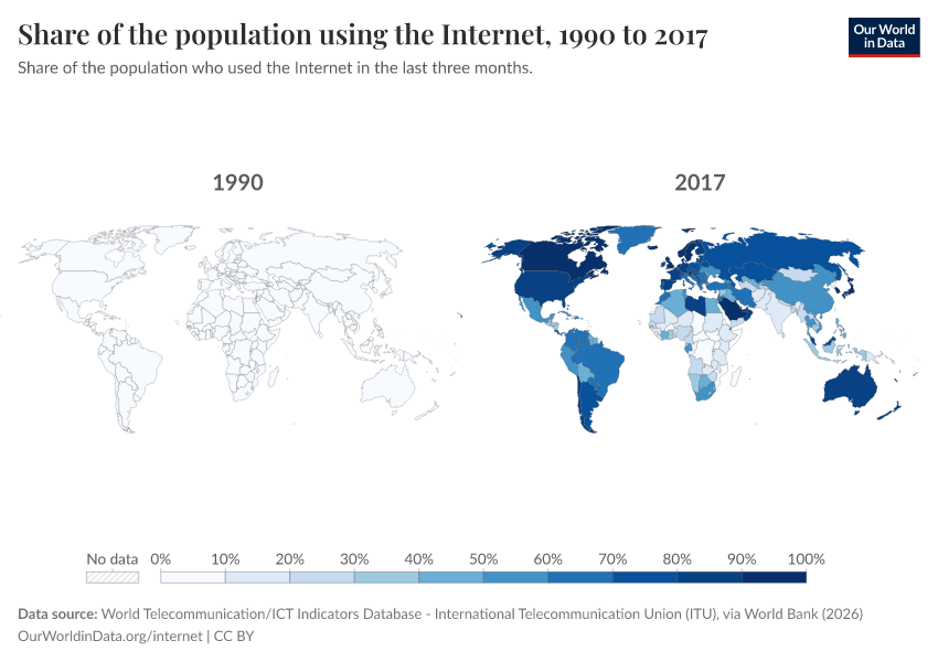 “Data Page: Share of the population using the Internet”, part of the following publication: Hannah Ritchie, Edouard Mathieu, Max Roser, and Esteban Ortiz-Ospina (2023) - “Internet”. Data adapted from World Telecommunication/ICT Indicators Database - International Telecommunication Union (ITU), via World Bank. Retrieved from https://archive.ourworldindata.org/20260202-181317/grapher/share-of-individuals-using-the-internet.html [online resource] (archived on February 2, 2026).How to cite this data