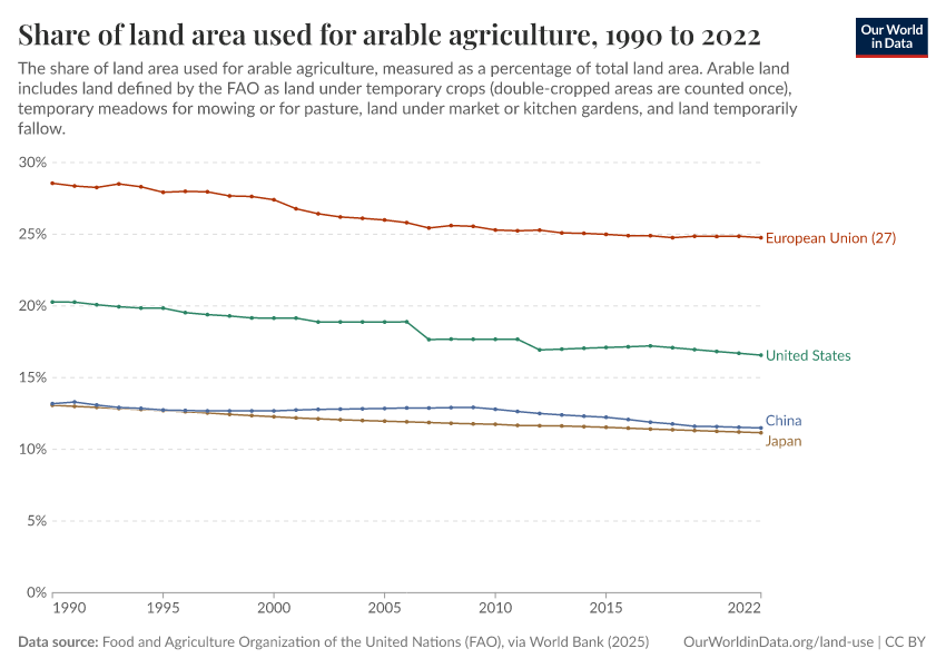 Food and Agriculture Organization of the United Nations (FAO), via World Bank (2025) – processed by Our World in Data. “Share of land area used for arable agriculture” [dataset]. Food and Agriculture Organization of the United Nations (FAO), via World Bank, “World Development Indicators 122” [original data]. Retrieved January 15, 2026 from https://archive.ourworldindata.org/20260112-111535/grapher/share-of-land-area-used-for-arable-agriculture.html (archived on January 12, 2026).
