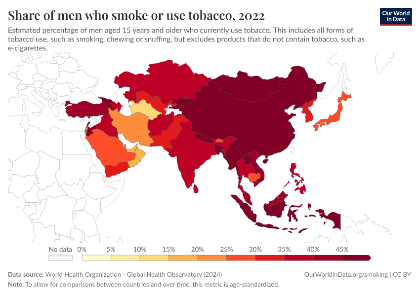 “Data Page: Share of men who smoke or use tobacco”, part of the following publication: Hannah Ritchie and Max Roser (2023) - “Smoking”. Data adapted from World Health Organization. Retrieved from https://archive.ourworldindata.org/20250925-232706/grapher/share-of-men-who-are-smoking.html [online resource] (archived on September 25, 2025).How to cite this data