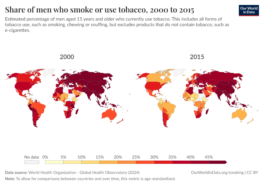 “Data Page: Share of men who smoke or use tobacco”, part of the following publication: Hannah Ritchie and Max Roser (2023) - “Smoking”. Data adapted from World Health Organization. Retrieved from https://archive.ourworldindata.org/20260402-164039/grapher/share-of-men-who-are-smoking.html [online resource] (archived on April 2, 2026).