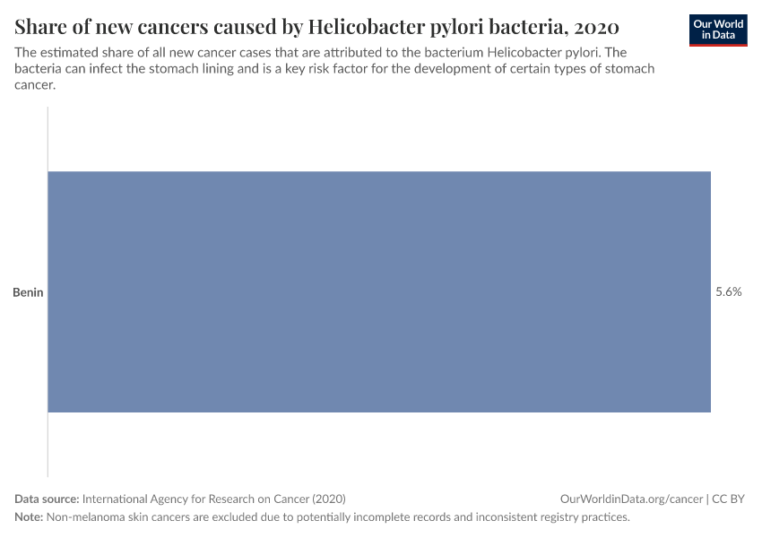 International Agency for Research on Cancer (2020) – with minor processing by Our World in Data. “Share of new cancers caused by Helicobacter pylori bacteria” [dataset]. International Agency for Research on Cancer, “Cancers Attributable to Infections” [original data]. Retrieved January 11, 2026 from https://archive.ourworldindata.org/20250909-093708/grapher/share-of-new-cancers-caused-by-helicobacter-pylori-bacteria.html (archived on September 9, 2025).