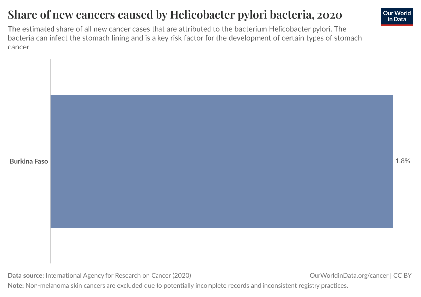 International Agency for Research on Cancer (2020) – with minor processing by Our World in Data. “Share of new cancers caused by Helicobacter pylori bacteria” [dataset]. International Agency for Research on Cancer, “Cancers Attributable to Infections” [original data]. Retrieved January 5, 2026 from https://archive.ourworldindata.org/20250909-093708/grapher/share-of-new-cancers-caused-by-helicobacter-pylori-bacteria.html (archived on September 9, 2025).