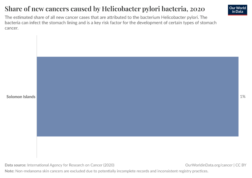 International Agency for Research on Cancer (2020) – with minor processing by Our World in Data. “Share of new cancers caused by Helicobacter pylori bacteria” [dataset]. International Agency for Research on Cancer, “Cancers Attributable to Infections” [original data]. Retrieved December 25, 2025 from https://archive.ourworldindata.org/20250909-093708/grapher/share-of-new-cancers-caused-by-helicobacter-pylori-bacteria.html (archived on September 9, 2025).