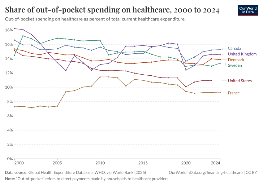 “Data Page: Share of out-of-pocket spending on healthcare”. Our World in Data (2026). Data adapted from Global Health Expenditure Database, WHO, via World Bank. Retrieved from https://archive.ourworldindata.org/20260304-094028/grapher/share-of-out-of-pocket-expenditure-on-healthcare.html [online resource] (archived on March 4, 2026).How to cite this data
