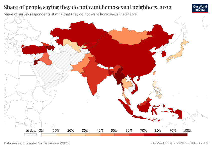 Integrated Values Surveys (2024) – with major processing by Our World in Data. “Share of people saying they do not want homosexual neighbors – Integrated Values Surveys” [dataset]. Integrated Values Surveys, “Integrated Values Surveys (IVS) Version 4” [original data]. Retrieved December 5, 2025 from https://archive.ourworldindata.org/20251031-165340/grapher/share-of-people-saying-they-do-not-want-homosexual-neighbors.html (archived on October 31, 2025).