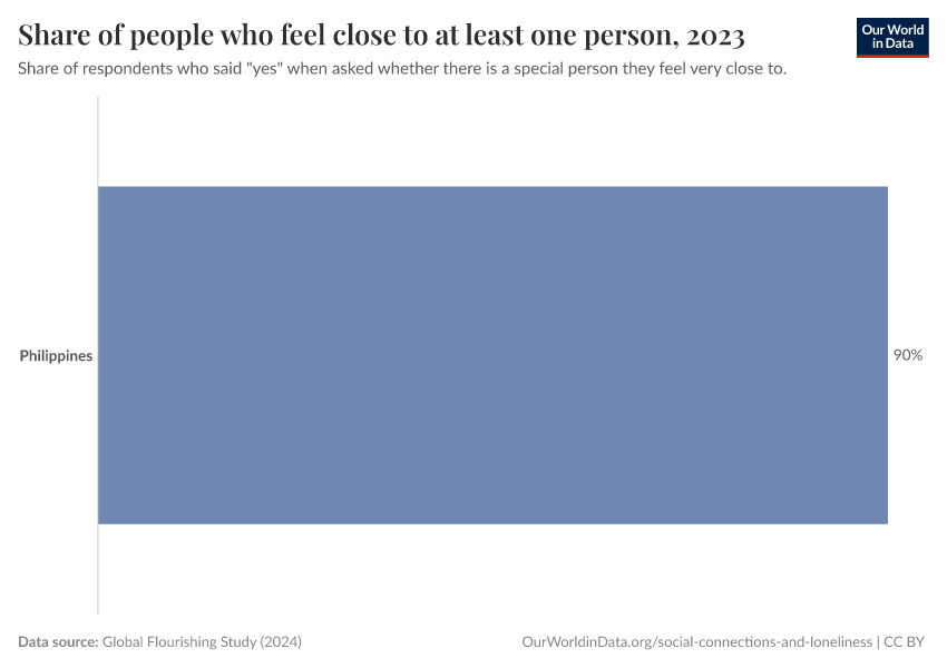 “Data Page: Share of people who feel close to at least one person”. Our World in Data (2025). Data adapted from Global Flourishing Study. Retrieved from https://archive.ourworldindata.org/20250909-093708/grapher/share-of-people-who-feel-close-to-at-least-one-person.html [online resource] (archived on September 9, 2025).How to cite this data
