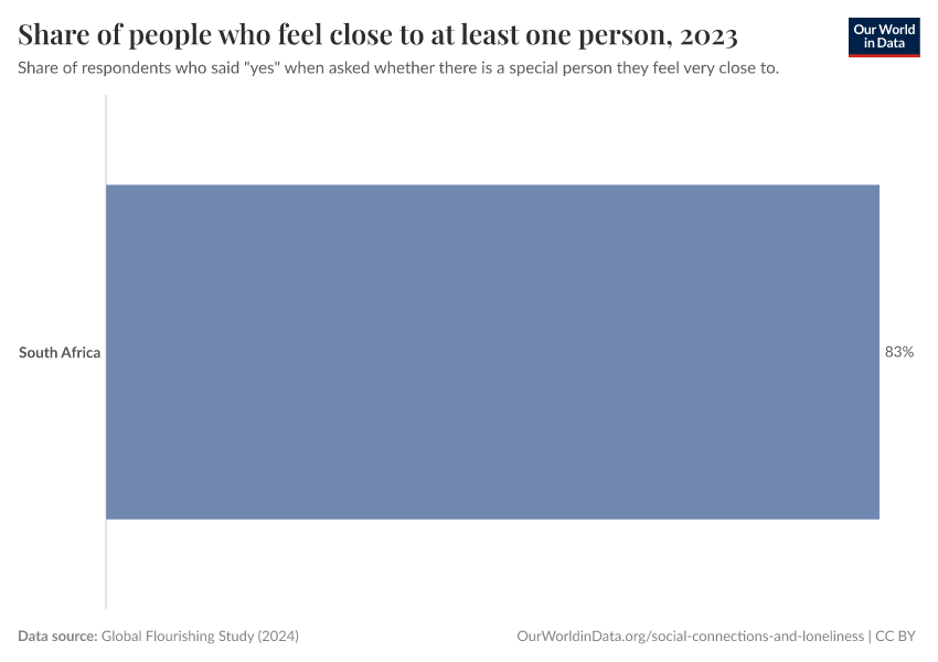Global Flourishing Study (2024) – with major processing by Our World in Data. “Share of people who feel close to at least one person” [dataset]. Global Flourishing Study, “Global Flourishing Study” [original data]. Retrieved December 27, 2025 from https://archive.ourworldindata.org/20250909-093708/grapher/share-of-people-who-feel-close-to-at-least-one-person.html (archived on September 9, 2025).