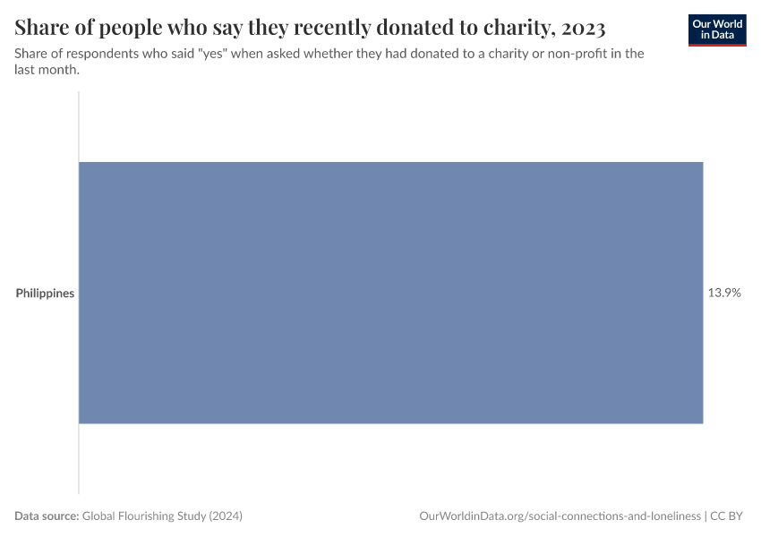 “Data Page: Share of people who say they recently donated to charity”. Our World in Data (2025). Data adapted from Global Flourishing Study. Retrieved from https://archive.ourworldindata.org/20250909-093708/grapher/share-of-people-who-recently-donated-to-charity.html [online resource] (archived on September 9, 2025).