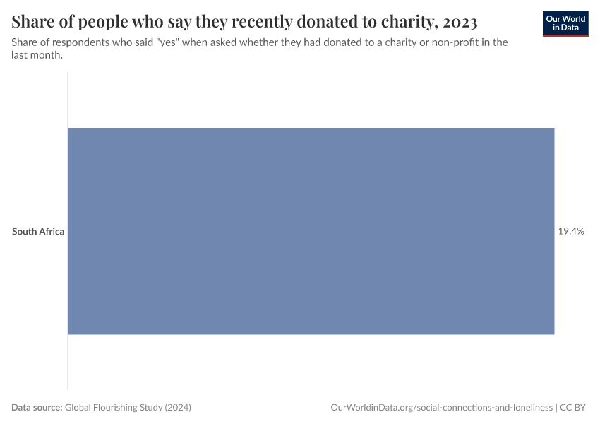 “Data Page: Share of people who say they recently donated to charity”. Our World in Data (2025). Data adapted from Global Flourishing Study. Retrieved from https://archive.ourworldindata.org/20250909-093708/grapher/share-of-people-who-recently-donated-to-charity.html [online resource] (archived on September 9, 2025).How to cite this data