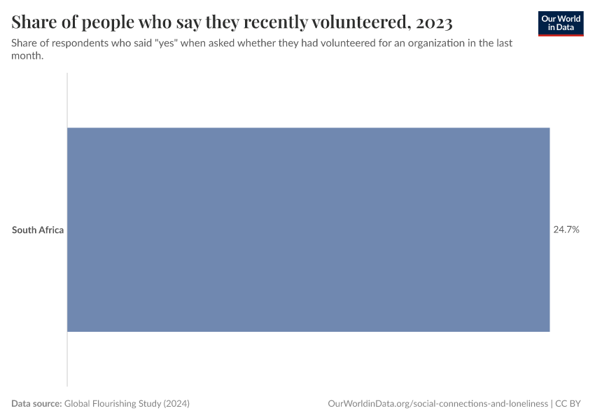 “Data Page: Share of people who say they recently volunteered”. Our World in Data (2025). Data adapted from Global Flourishing Study. Retrieved from https://archive.ourworldindata.org/20250909-093708/grapher/share-of-people-who-recently-volunteered.html [online resource] (archived on September 9, 2025).How to cite this data