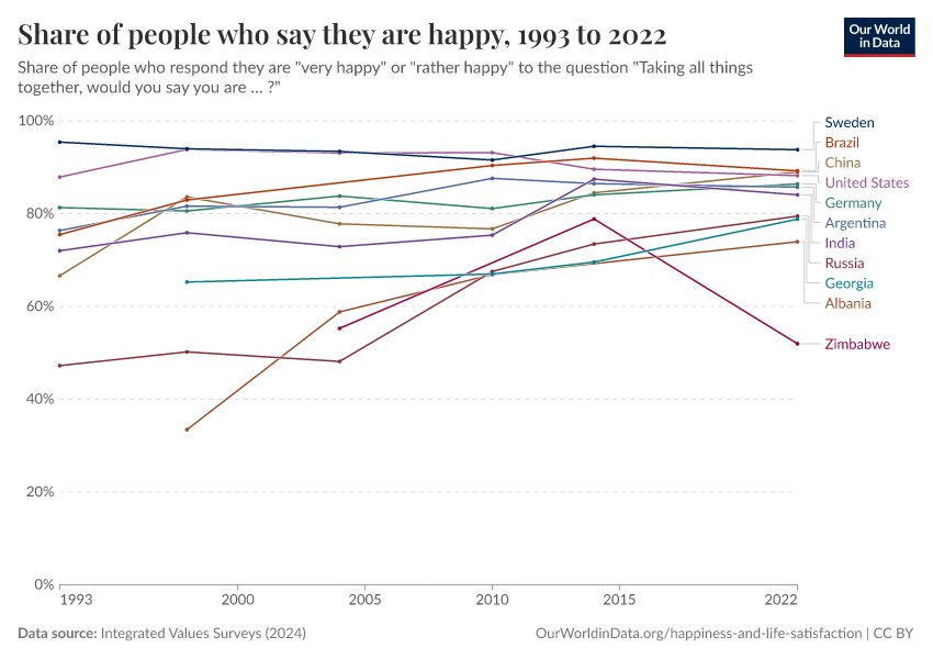 Integrated Values Surveys (2024) – with major processing by Our World in Data. “Share of people who say they are happy – Integrated Values Surveys” [dataset]. Integrated Values Surveys, “Integrated Values Surveys (IVS) Version 4” [original data]. Retrieved January 15, 2026 from https://archive.ourworldindata.org/20260113-113137/grapher/share-of-people-who-say-they-are-happy.html (archived on January 13, 2026).