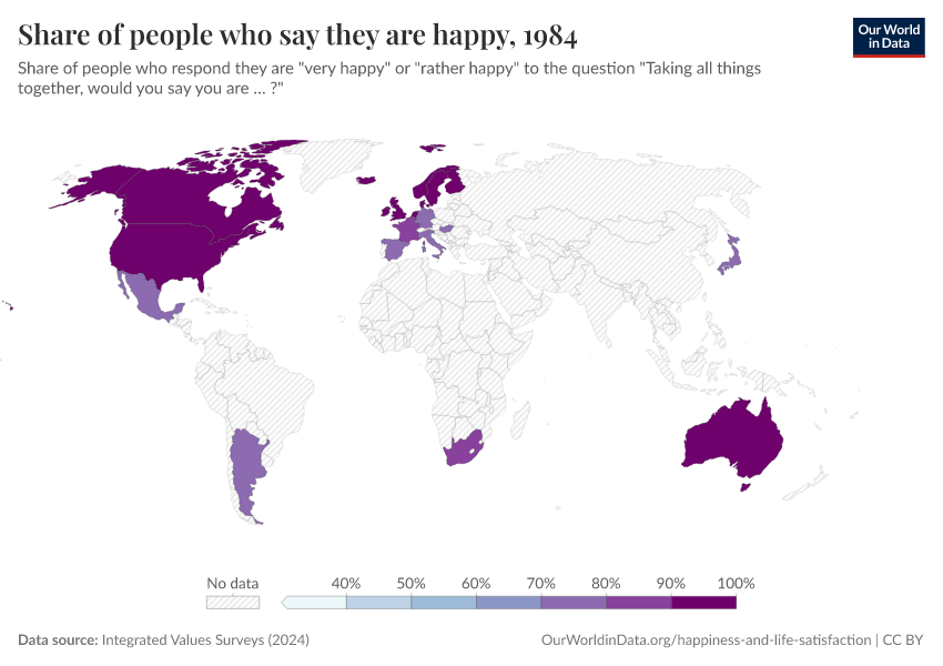 Integrated Values Surveys (2024) – with major processing by Our World in Data. “Share of people who say they are happy – Integrated Values Surveys” [dataset]. Integrated Values Surveys, “Integrated Values Surveys (IVS) Version 4” [original data]. Retrieved January 14, 2026 from https://archive.ourworldindata.org/20260113-113137/grapher/share-of-people-who-say-they-are-happy.html (archived on January 13, 2026).