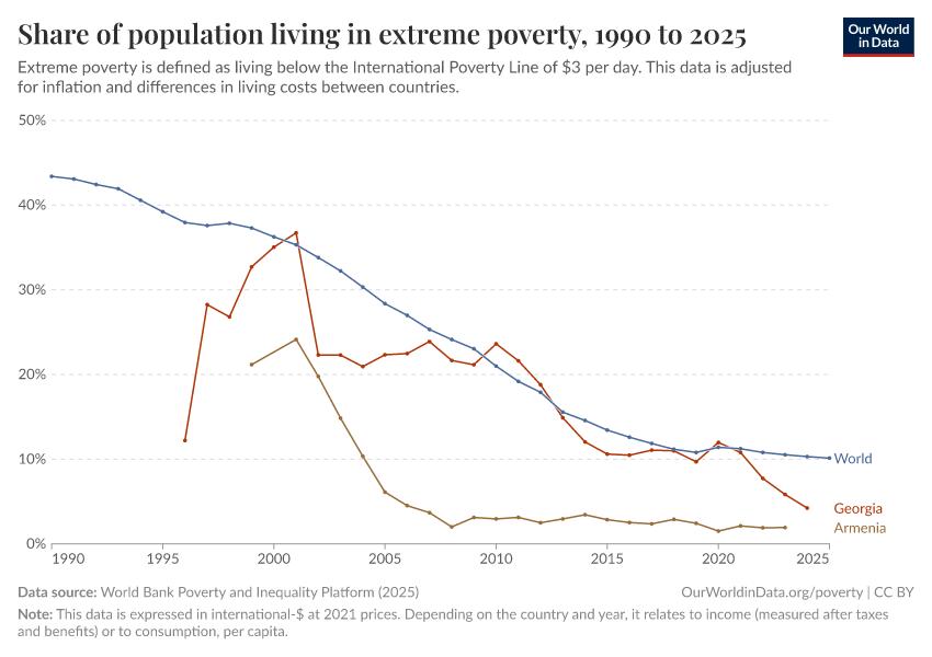 World Bank Poverty and Inequality Platform (2025) – with major processing by Our World in Data. “Share of population living in extreme poverty – World Bank” [dataset]. World Bank Poverty and Inequality Platform, “World Bank Poverty and Inequality Platform (PIP) 20250930_2021, 20250930_2017” [original data]. Retrieved December 14, 2025 from https://archive.ourworldindata.org/20251209-133038/grapher/share-of-population-in-extreme-poverty.html (archived on December 9, 2025).