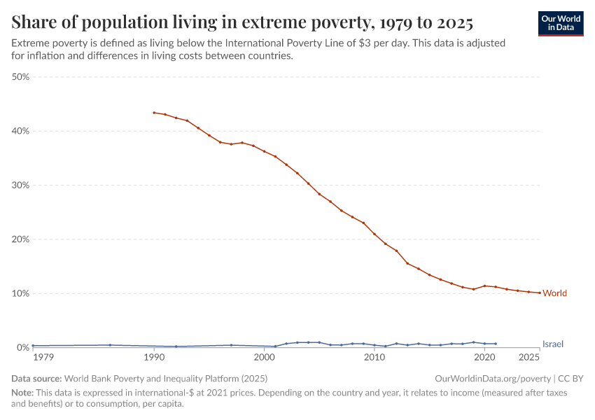World Bank Poverty and Inequality Platform (2025) – with major processing by Our World in Data. “Share of population living in extreme poverty – World Bank” [dataset]. World Bank Poverty and Inequality Platform, “World Bank Poverty and Inequality Platform (PIP) 20250930_2021, 20250930_2017” [original data]. Retrieved January 1, 2026 from https://archive.ourworldindata.org/20251209-133038/grapher/share-of-population-in-extreme-poverty.html (archived on December 9, 2025).