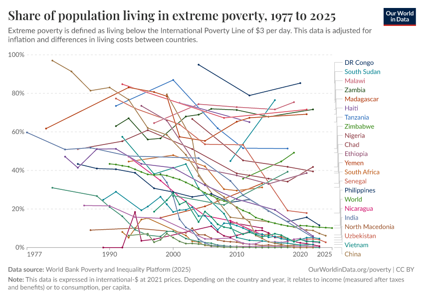 World Bank Poverty and Inequality Platform (2025) – with major processing by Our World in Data. “Share of population living in extreme poverty – World Bank” [dataset]. World Bank Poverty and Inequality Platform, “World Bank Poverty and Inequality Platform (PIP) 20250930_2021, 20250930_2017” [original data]. Retrieved December 9, 2025 from https://archive.ourworldindata.org/20251030-150046/grapher/share-of-population-in-extreme-poverty.html (archived on October 30, 2025).