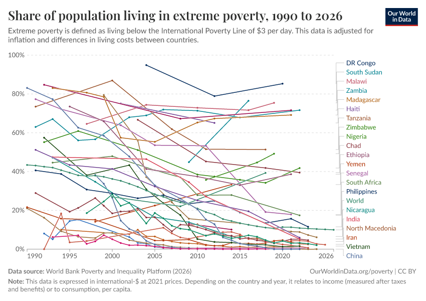 World Bank Poverty and Inequality Platform (2025) – with major processing by Our World in Data. “Share of population living in extreme poverty – World Bank” [dataset]. World Bank Poverty and Inequality Platform, “World Bank Poverty and Inequality Platform (PIP) 20250930_2021, 20250930_2017” [original data]. Retrieved March 8, 2026 from https://archive.ourworldindata.org/20260304-094028/grapher/share-of-population-in-extreme-poverty.html (archived on March 4, 2026).