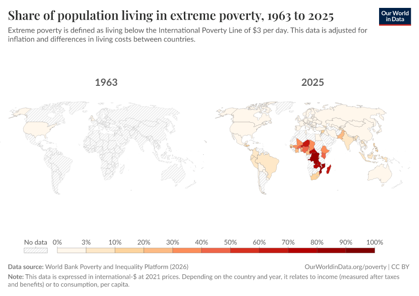 World Bank Poverty and Inequality Platform (2026) – with major processing by Our World in Data. “Share of population living in extreme poverty – World Bank” [dataset]. World Bank Poverty and Inequality Platform, “World Bank Poverty and Inequality Platform (PIP) 20260324_2021, 20260324_2017” [original data]. Retrieved April 26, 2026 from https://archive.ourworldindata.org/20260422-113457/grapher/share-of-population-in-extreme-poverty.html (archived on April 22, 2026).