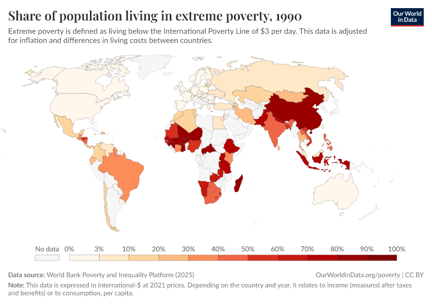 World Bank Poverty and Inequality Platform (2025) – with major processing by Our World in Data. “Share of population living in extreme poverty – World Bank” [dataset]. World Bank Poverty and Inequality Platform, “World Bank Poverty and Inequality Platform (PIP) 20250930_2021, 20250930_2017” [original data]. Retrieved January 10, 2026 from https://archive.ourworldindata.org/20251209-133038/grapher/share-of-population-in-extreme-poverty.html (archived on December 9, 2025).