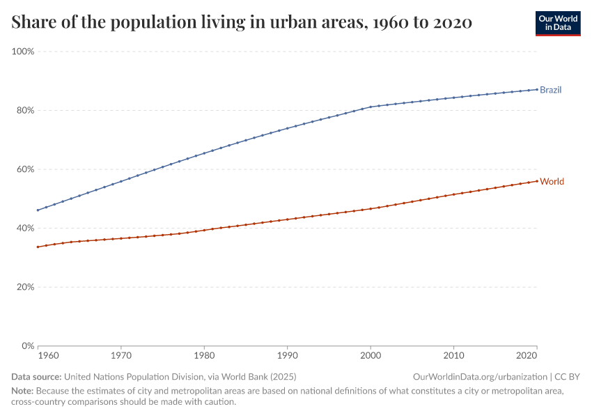 “Data Page: Share of the population living in urban areas”. Our World in Data (2025). Data adapted from United Nations Population Division, via World Bank. Retrieved from https://archive.ourworldindata.org/20250916-102301/grapher/share-of-population-urban.html [online resource] (archived on September 16, 2025).How to cite this data