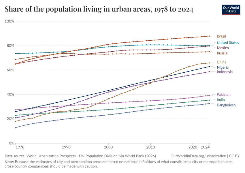 “Data Page: Share of the population living in urban areas”. Our World in Data (2026). Data adapted from World Urbanization Prospects - UN Population Division, via World Bank. Retrieved from https://archive.ourworldindata.org/20260304-094028/grapher/share-of-population-urban.html [online resource] (archived on March 4, 2026).