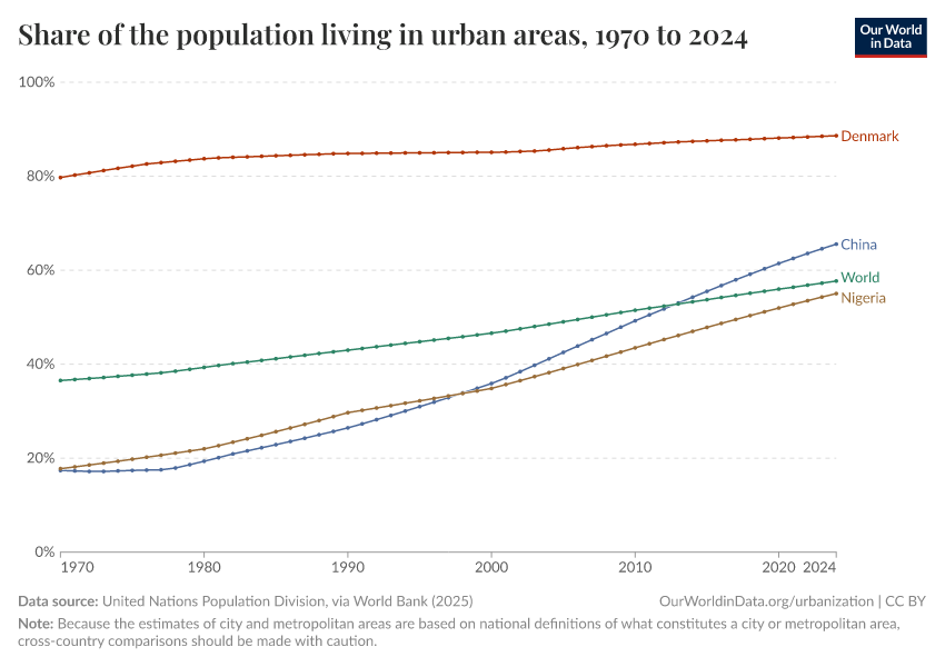 “Data Page: Share of the population living in urban areas”. Our World in Data (2025). Data adapted from United Nations Population Division, via World Bank. Retrieved from https://archive.ourworldindata.org/20250916-102301/grapher/share-of-population-urban.html [online resource] (archived on September 16, 2025).How to cite this data
