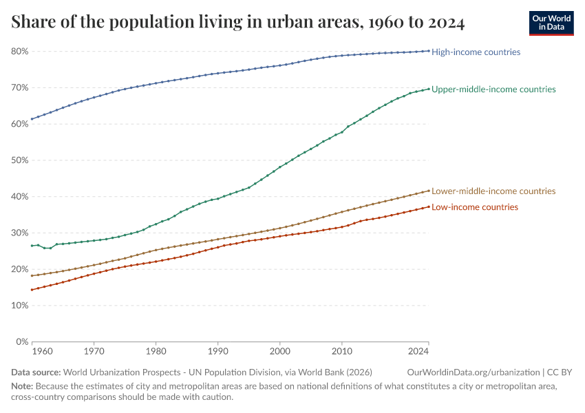 “Data Page: Share of the population living in urban areas”. Our World in Data (2026). Data adapted from World Urbanization Prospects - UN Population Division, via World Bank. Retrieved from https://archive.ourworldindata.org/20260202-181317/grapher/share-of-population-urban.html [online resource] (archived on February 2, 2026).How to cite this data