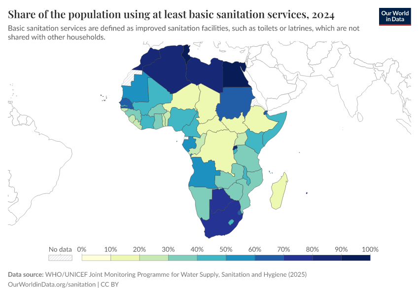 WHO/UNICEF Joint Monitoring Programme for Water Supply, Sanitation and Hygiene (2025) – processed by Our World in Data. “Share of the population using at least basic sanitation services” [dataset]. World Health Organization/UNICEF Joint Monitoring Programme for Water Supply, Sanitation and Hygiene, “WHO/UNICEF Joint Monitoring Programme for Water Supply, Sanitation and Hygiene (JMP) 2000-2024 report” [original data]. Retrieved January 16, 2026 from https://archive.ourworldindata.org/20260109-172523/grapher/share-of-population-with-improved-sanitation-faciltities.html (archived on January 9, 2026).