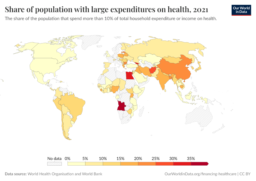 “Data Page: Share of population with large expenditures on health”. Our World in Data (2025). Data adapted from World Health Organisation and World Bank. Retrieved from https://archive.ourworldindata.org/20251125-165536/grapher/share-of-population-with-large-household-expenditures-on-health-10pc.html [online resource] (archived on November 25, 2025).How to cite this data