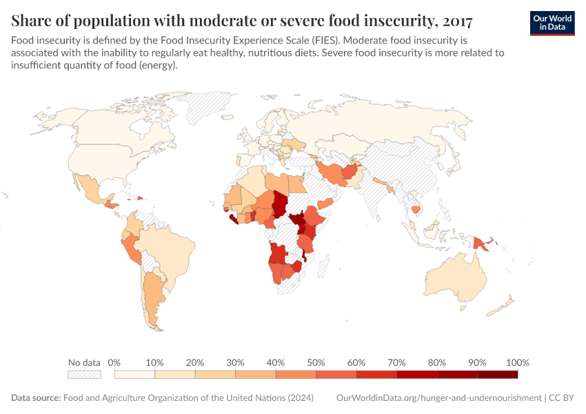 Food and Agriculture Organization of the United Nations (2024) – with major processing by Our World in Data. “Prevalence of moderate or severe food insecurity in the total population – UN FAO – 3-year average” [dataset]. Food and Agriculture Organization of the United Nations, “Food Security and Nutrition: Suite of Food Security Indicators” [original data]. Retrieved December 22, 2025 from https://archive.ourworldindata.org/20250909-093708/grapher/share-of-population-with-moderate-or-severe-food-insecurity.html (archived on September 9, 2025).