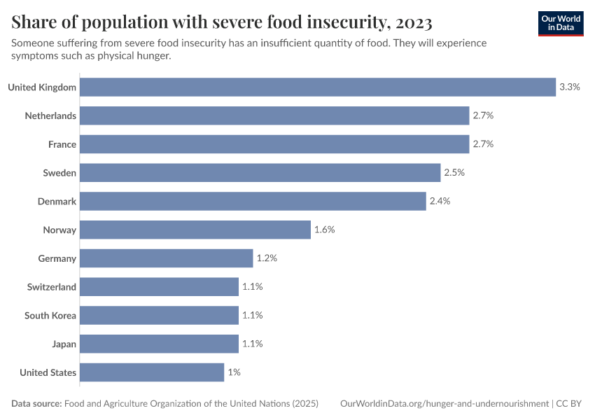 Food and Agriculture Organization of the United Nations (2025) – with major processing by Our World in Data. “Prevalence of severe food insecurity in the total population – UN FAO – 3-year average” [dataset]. Food and Agriculture Organization of the United Nations, “Food Security and Nutrition: Suite of Food Security Indicators” [original data]. Retrieved March 10, 2026 from https://archive.ourworldindata.org/20260304-094028/grapher/share-of-population-with-severe-food-insecurity.html (archived on March 4, 2026).