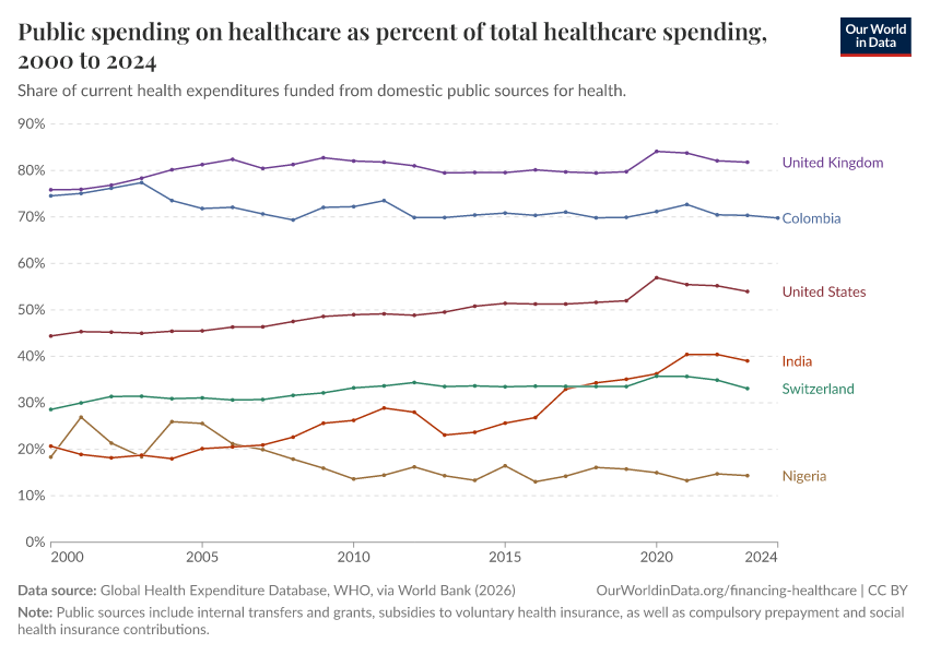 “Data Page: Public spending on healthcare as percent of total healthcare spending”. Our World in Data (2026). Data adapted from Global Health Expenditure Database, WHO, via World Bank. Retrieved from https://archive.ourworldindata.org/20260304-094028/grapher/share-of-public-expenditure-on-healthcare-by-country.html [online resource] (archived on March 4, 2026).