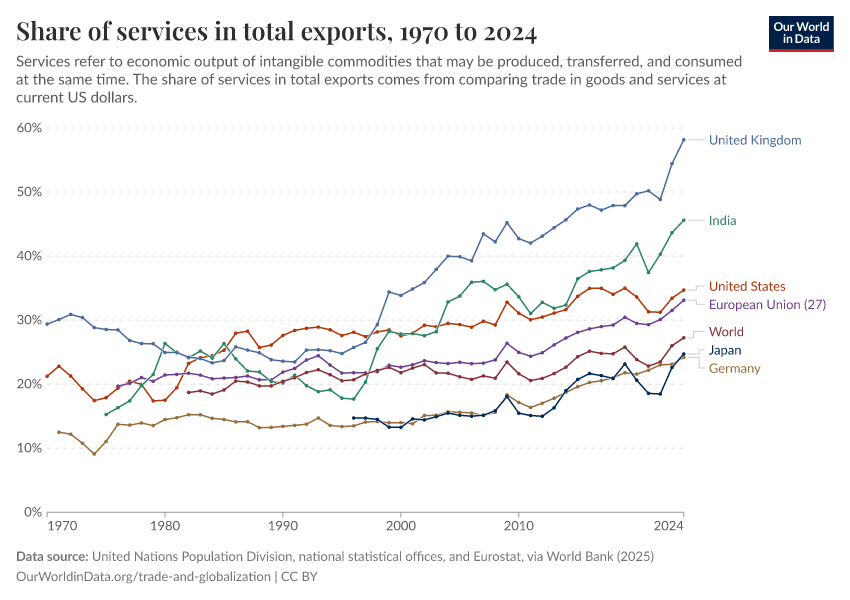 “Data Page: Share of services in total exports”. Our World in Data (2026). Data adapted from United Nations Population Division, national statistical offices, and Eurostat, via World Bank. Retrieved from https://archive.ourworldindata.org/20260112-111535/grapher/share-of-services-in-total-exports.html [online resource] (archived on January 12, 2026).How to cite this data