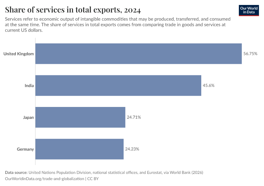 “Data Page: Share of services in total exports”. Our World in Data (2026). Data adapted from United Nations Population Division, national statistical offices, and Eurostat, via World Bank. Retrieved from https://archive.ourworldindata.org/20260202-181317/grapher/share-of-services-in-total-exports.html [online resource] (archived on February 2, 2026).