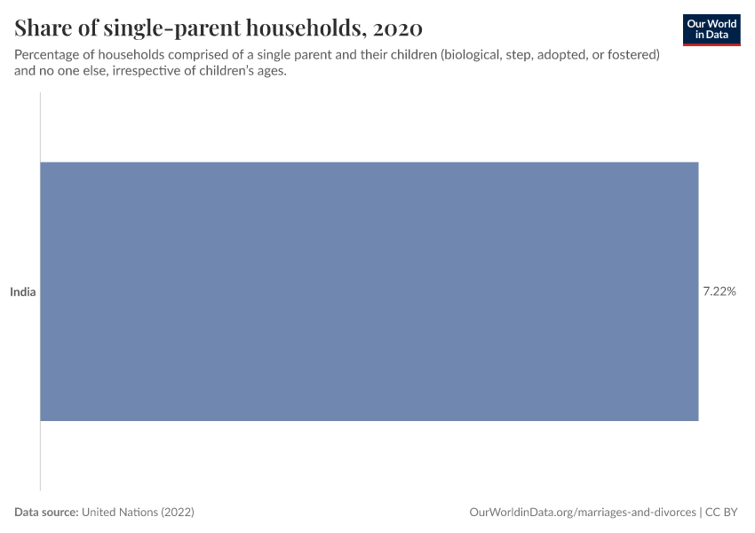 “Data Page: Share of single-parent households”, part of the following publication: Bastian Herre, Veronika Samborska, Esteban Ortiz-Ospina, and Max Roser (2020) - “Marriages and Divorces”. Data adapted from United Nations. Retrieved from https://archive.ourworldindata.org/20260304-094028/grapher/share-of-single-parent-households.html [online resource] (archived on March 4, 2026).How to cite this data