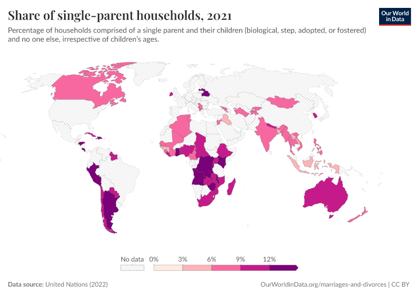 United Nations (2022) – processed by Our World in Data. “Share of single-parent households” [dataset]. United Nations, “Household Size and Composition” [original data]. Retrieved April 9, 2026 from https://archive.ourworldindata.org/20260304-094028/grapher/share-of-single-parent-households.html (archived on March 4, 2026).